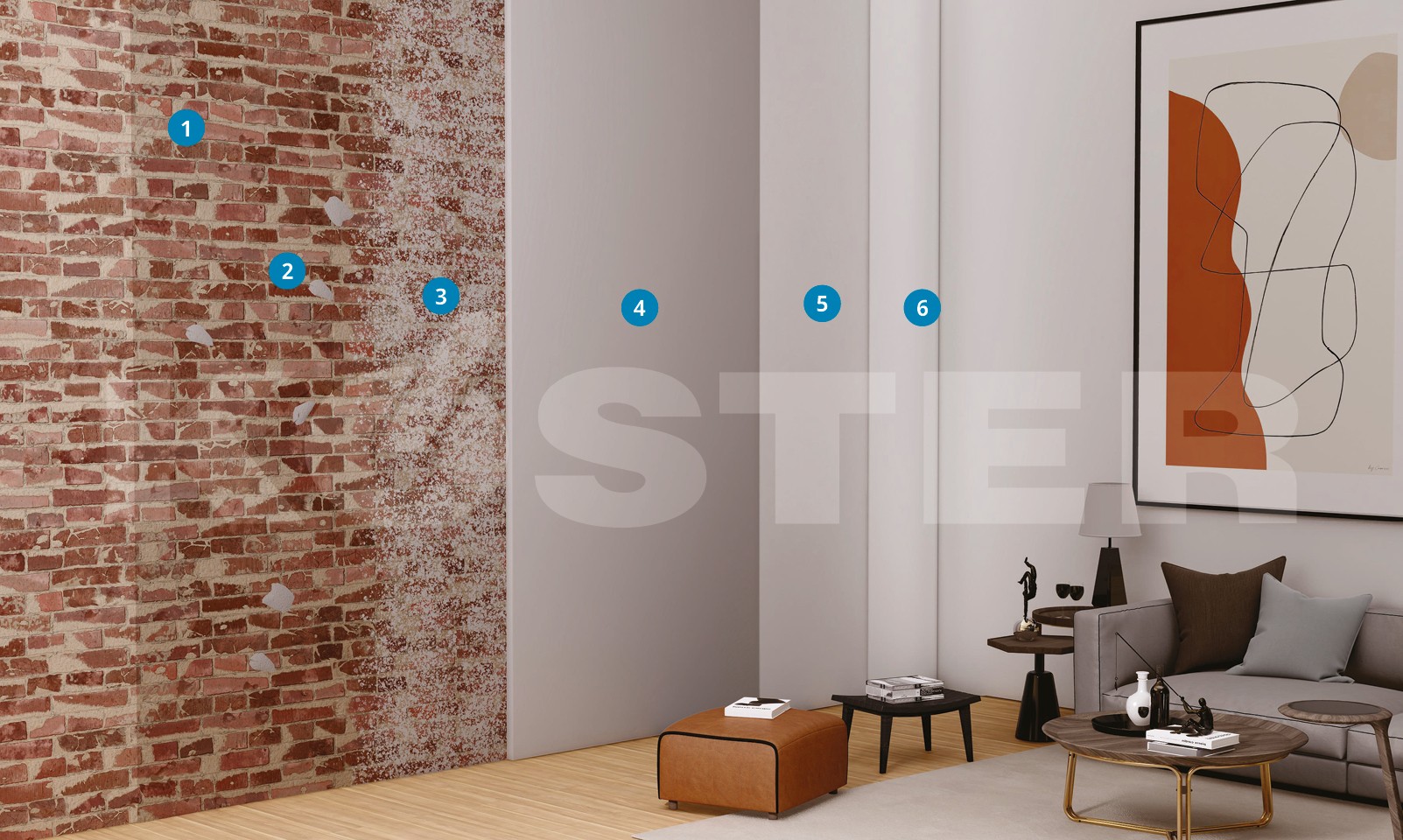 KÖSTER Restoration Plasters are available in different varieties (grey, white, fast and light). KÖSTER Restoration Plaster White is often used in older buildings without subsequent painting. KÖSTER Fine Plaster creates a smooth decorative surface and can be applied when desired to meet architectural goals. KÖSTER Restoration Plasters can only be painted over with breathable (open to vapor diffusion) paint such as KÖSTER Silicon Paint White.